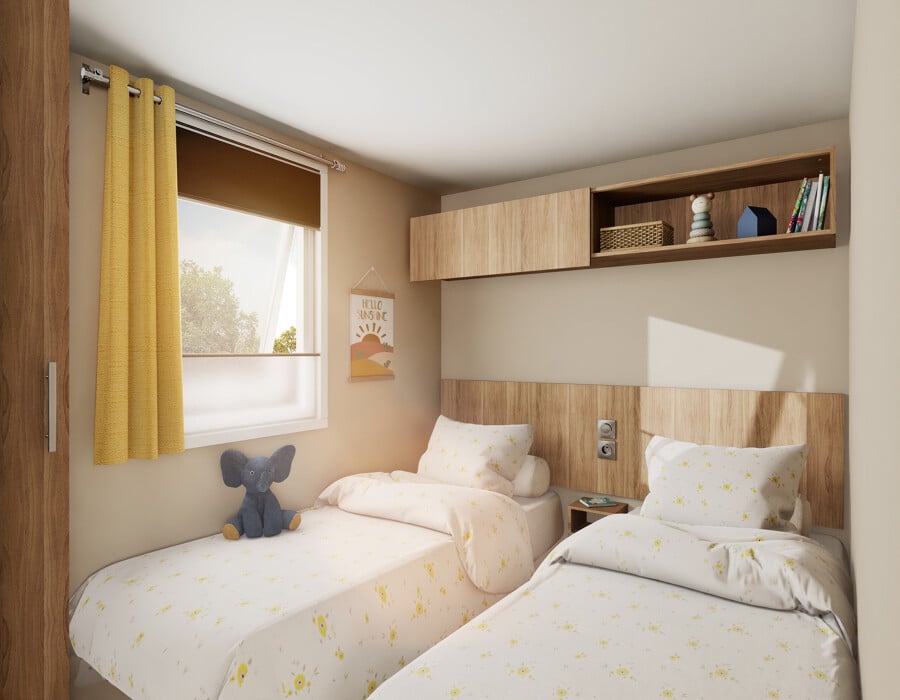 Les 2 chambres enfants/invités identiques offrent chacune 2 lits 80 x 190 cm avec matelas mousse anallergique haute résilience 35 kg/m³ labellisé OEKO-TEX, une large tête de lit de protection, 1 chevet amovible, un meuble pont en tête de lit à porte coulissante, une penderie lingère 1 porte et un combistore occultant moustiquaire.